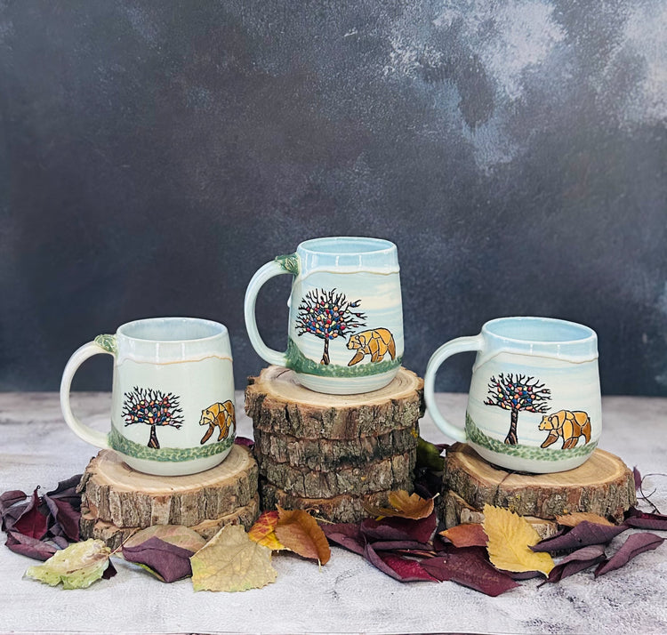 Each Mosaic Bear and Tree is hand carved and painted on marbled porcelain that has been burnished and sanded to achieve a smooth and soft exterior. Carvings are covered with a protective clear glaze. Mugs range from 14-17 oz capacity and range in price from $80-85
